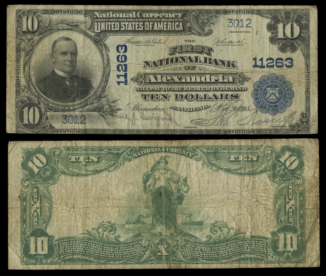 Pennsylvania. Alexandria. Ch.11263. First National Bank of Alexandria. $10. 1902 Plain back. Fr.632. No. 3012. Some pinholes. Fine.