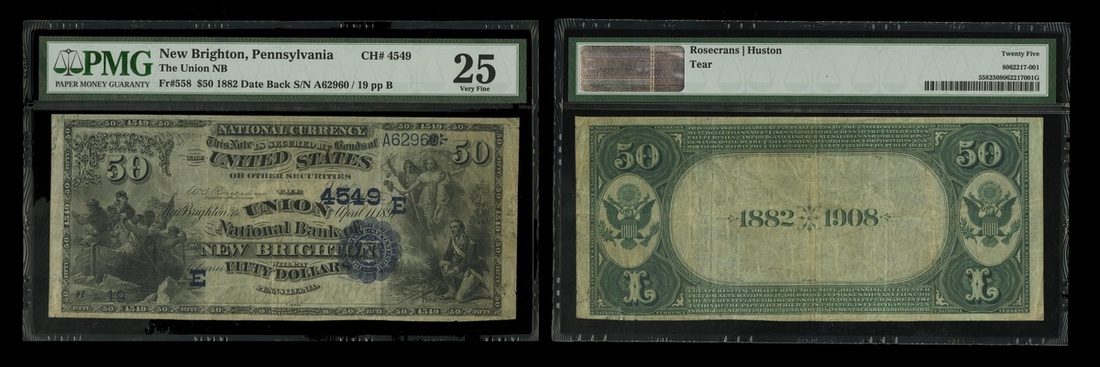 Pennsylvania. New Brighton. Ch.4549. The Union National Bank of New Brighton. $50. 1882 Date back. Fr.558. No. 19. Washington crossing the Delaware at left, Washington at prayer at right. PMG Very Fine 25.