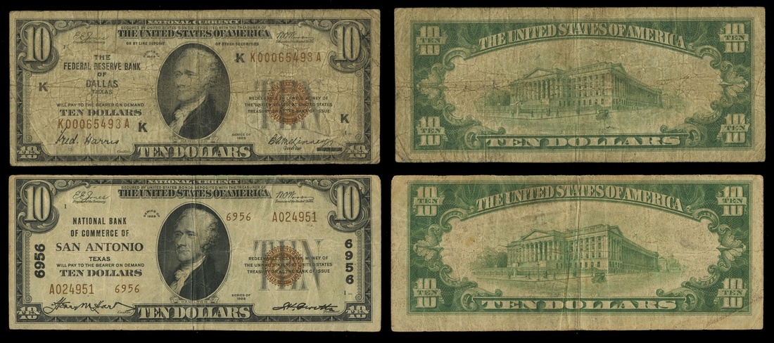 Texas. San Antonio. Ch. 6956. National Bank of Commerce of San Antonio. $10. 1929 Type II. No. A024951. Fine; also $10 Federal Reserve Bank Note, Dallas. 1929. VG. [2]