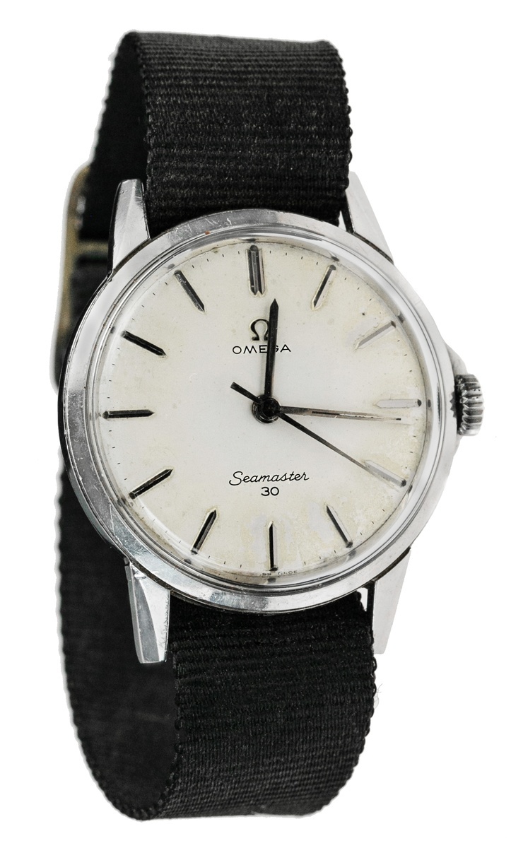 Omega Seamaster 30 Watch. Circa 1960s. Discolored white face, with metal baton hour markers. Nylon watch band. Scratches on underside, with tarnished rods on reverse. 32 mm.