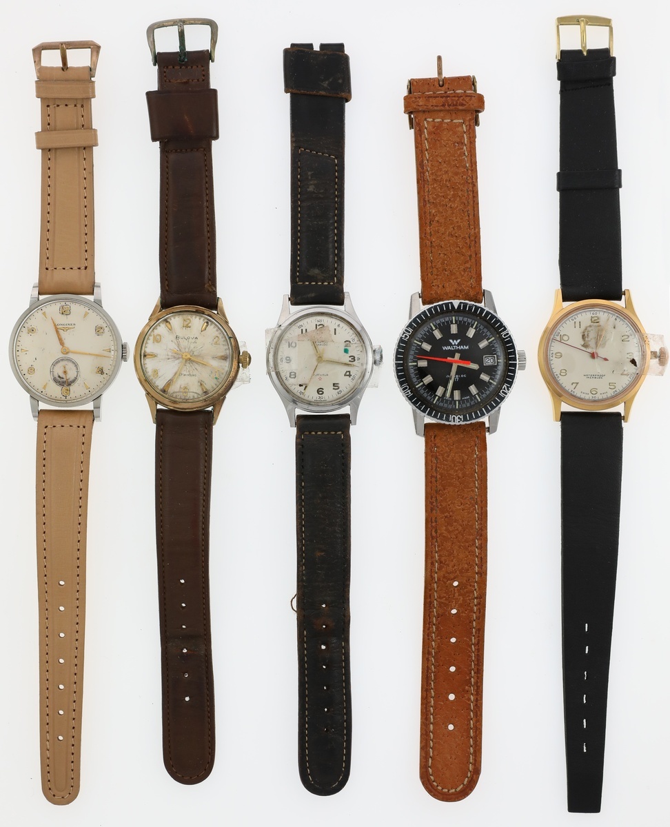 A Grouping of Gentleman's Wrist Watches. Contains: Waltham, stainless steel, date window, 33 mm.; Avalon, crown is broken, 26 mm.; Bulova, in working condition, crown is broken; Longines, seconds dial at 6 o'clock, 30 mm.; unnamed watch, crown is broken, 30mm. [5]