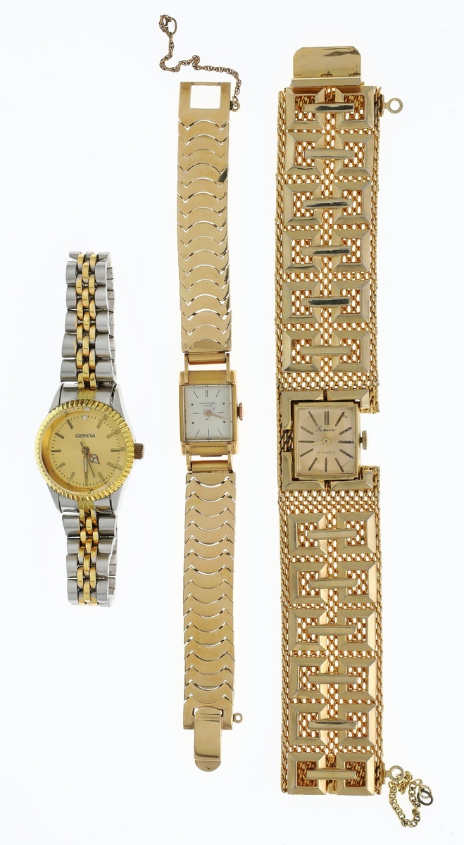An Assortment of Geneva Wrist Watches. Geneva, abstract numerals, with crystal at 12:00, in original box, 20 mm. Geneva, abstract numerals, interlocking square design on band, safety chain is not attached at one end, engraved on reverse "D.L. MJGC, 1971". Geneva, abstract numerals, stamped "151491273675" on reverse, safety chain is not connected at one end.