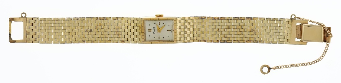 Piaget 14K Woman's Wrist Watch. Rectangle, polished metal face, with abstract numeral indicators. Stamped "14 K" on back and clasp. Weave pattern. Safety chain is not attached. 15 mm.