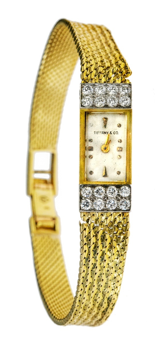 A Ladies' Gold Wristwatch by Tiffany & Co. . Circa 1960s. Delicate gold links, broken near face of watch. The face of the watch displays two rows of diamonds. Folding clasp, yellow mesh. Stamped 750 and 11.19? Missing dial on side of watch face. Otherwise fine.