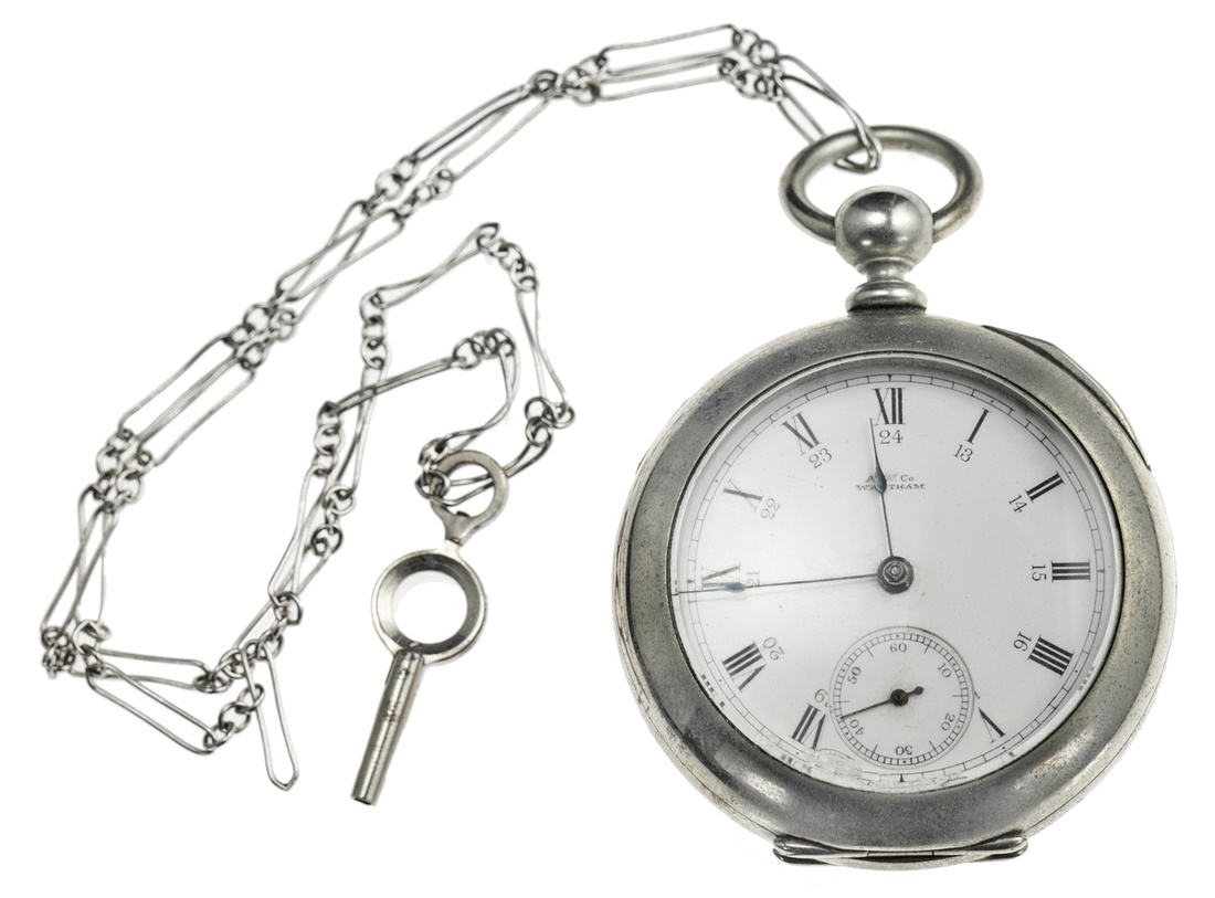 A Waltham Pocket Watch. White enamel dial with black metal hands. Seconds dial at 6 o'clock. On chain, with key. Small cracks on glass of case.