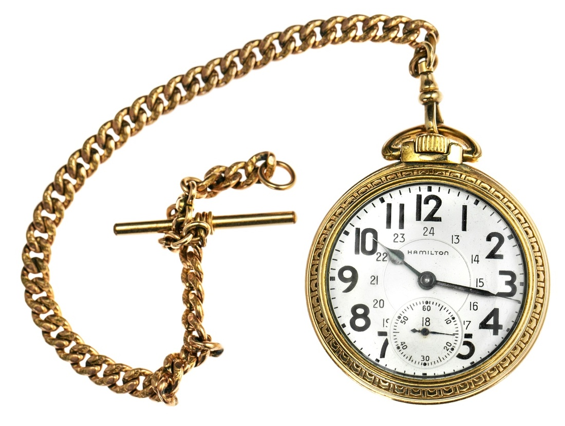 A Hamilton Pocket Watch. White enamel dial with black metal hands. Seconds dial at 6 o'clock. On curb-link chain. Possibly gold plated.