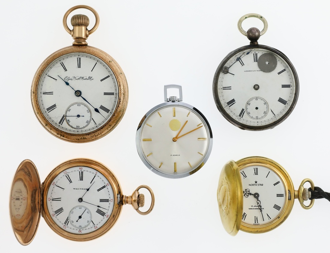 A Collection of Pocket Watches. Contains: Elgin National Watch Company, in filigree case; Waltham; North Star; American Watch Co., hands are broken; and Technos, in original case. Very fine condition.