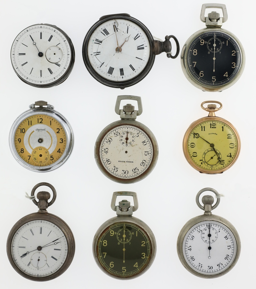 Assorted Pocket Watches. Contains: Elgin Timer, missing crystal; Illinois; Ingersoll, missing crystal; one has cracked crystal; and more. [9]