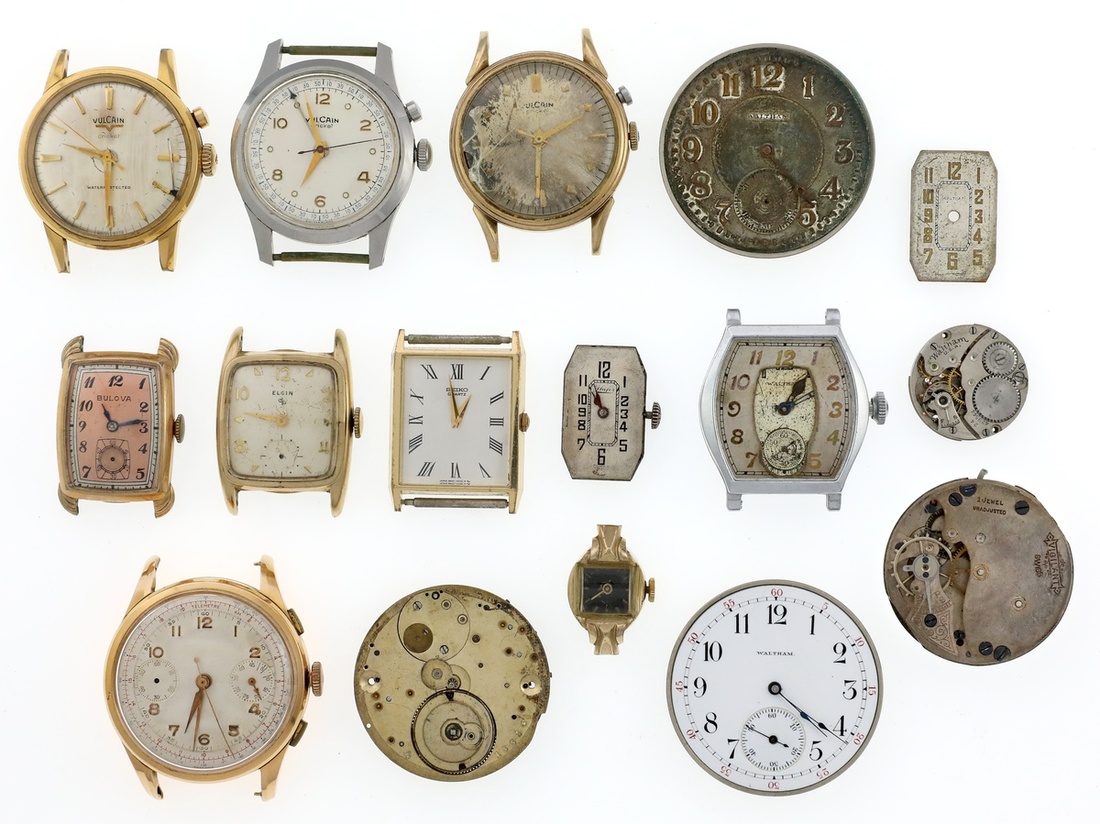 Pocket Watch and Wrist Watch Faces and Mechanics. Contains: Waltham, (5); Vigilant; Seiko; Vulcan, (3); and more. [16]
