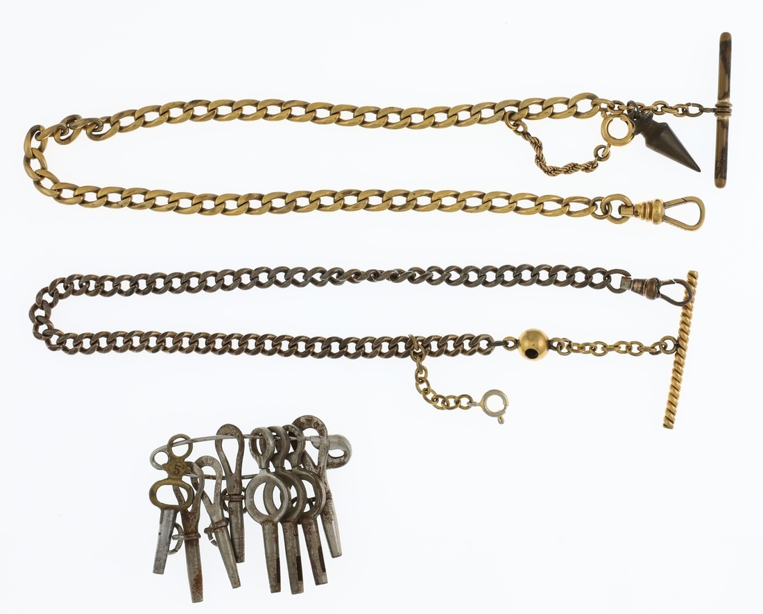 Pocket Watch Parts. Two pocket watch chains, both approx. 13 inches long and eight pocket watch keys.