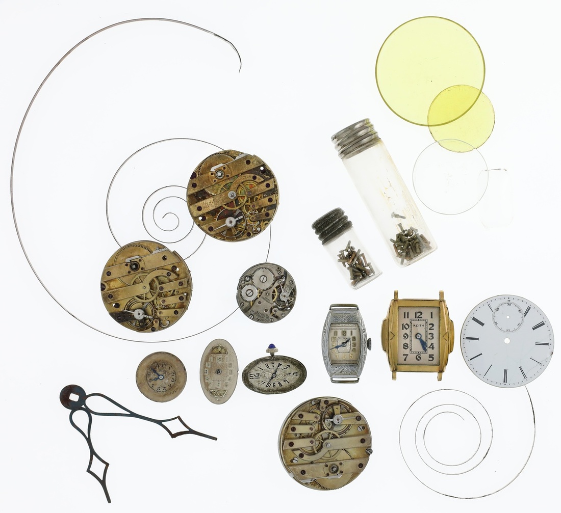 Miscellaneous Watch Parts. Contains: watch mechanics, faces (11), screws, and watch hands.