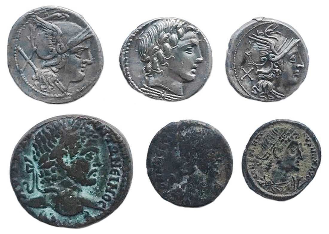 Roman Republic. Trio of Anonymous Denarii. 211-208 BC. Roma head right/The Dioscuri right on horseback. Craw.44/5, RSC 2. VF; 157-156 BC. Roma head right/Victory driving biga. Craw.197/1a, RSC 6. EF; ca. 86 BC. Apollo head right, thunderbolt below/Jupiter driving quadriga. Craw.350A/2, RSC 226. Near EF; also small Imperial AE (2) and Provincial AE. (6)