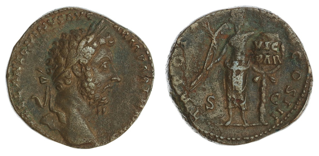 Roman Imperial. Marcus Aurelius (161-180). AE Sestertius, struck 166. Laureate head right, rev. Victory standing holding palm frond and affixing shield inscribed VIC / PAR onto palm tree. RIC 931. Light brown over very minor roughness. Very Fine