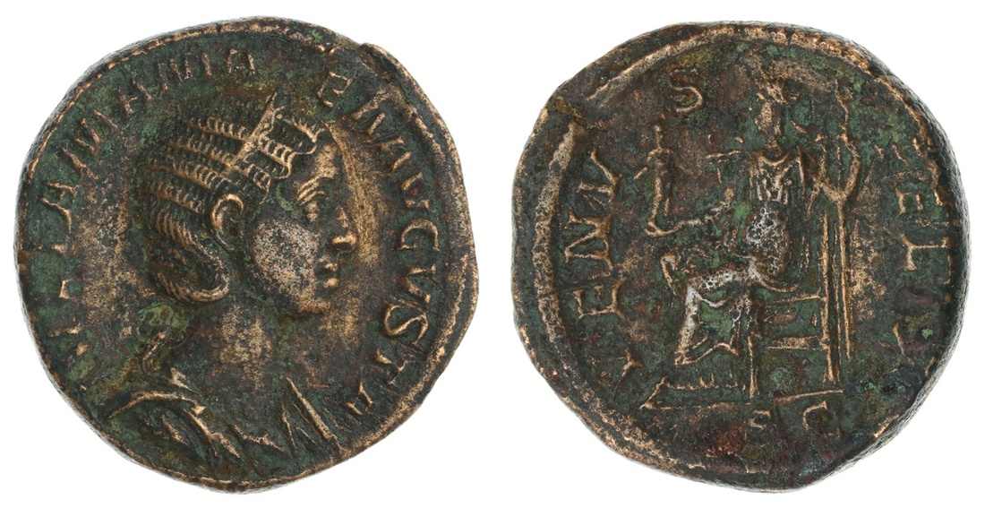 Roman Imperial. Julia Mamaea, Augusta (222-235). AE Sestertius, struck 224. Draped bust right wearing stephane, rev. Venus seated left, holding Cupid and scepter. RIC 701. Tan-brown over some roughness. Very Fine.