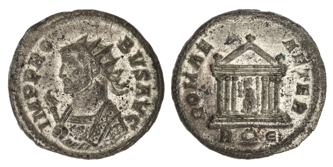 Roman Imperial. Probus (276-282). Antoninianus. Rome. Radiate bust left wearing imperial mantle and holding scepter surmounted by eagle, rev. Roma seated in temple, holding Victory and scepter, R (wreath) E in ex. RIC 187. Fully silvered. Choice About as Struck.
