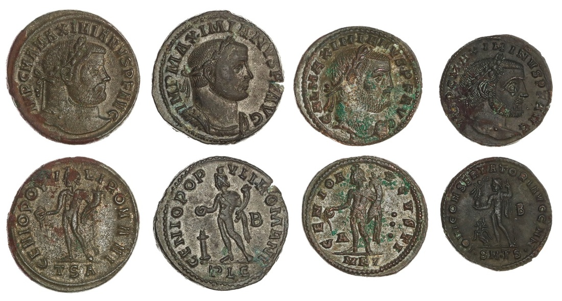 Roman Imperial. Maximianus (286-305). Quartet of Folles. Genius reverses (3) - Lugdunum, Thessalonica and Cyzicus; and curious Jupiter reverse. Jupiter left holding Victory, B in right field, strange figure below in left field. Extremely Fine. (4)