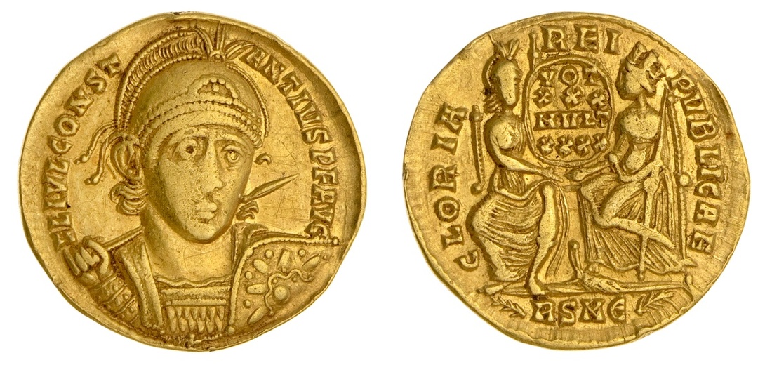 Roman Imperial. Constantius II (337-361). AV Solidus, struck 355-357. Rome. 4.22 gms. Pearl-diademed, helmeted and cuirassed bust ¾ right, spear over shoulder holding shield adorned with stellate pattern, rev. Roma and Constantinopolis enthroned holding shield between them inscribed VOT XXX / MVLT XXXX; RSME flanked by palms in ex. RIC 293. Light graffiti in obverse field. Very Fine.