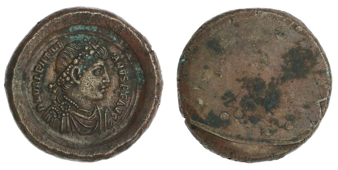 Roman Imperial. Valentinian I (367-375). Trial strike from obverse dies. AE, 27.3mm. Pearl-diademed, draped and cuirassed bust right. Good Very Fine.