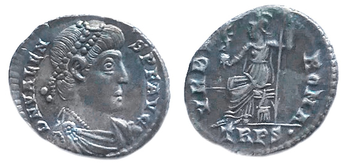 Roman Imperial. Eastern Roman Empire. Valens (364-378). AR Siliqua. Trier. 2.09 gms. Pearl-diademed, draped and cuirassed bust right, rev. Roma enthroned left holding Victory and scepter. RIC 27e.1. Toned. Good Very Fine.