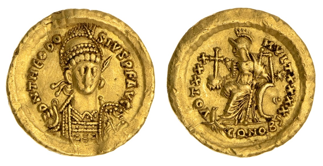 Roman Imperial. Eastern Roman Empire. Theodosius II (402-450). AV Solidus, struck 430-440. Constantinople, 3rd Officina. 4.46 gms. Pearl-diademed, helmeted and cuirassed bust facing, head 3/4 right, holding spear and shield, rev. Constantinopolis enthroned left, holding globus cruciger and scepter, foot on prow; legend ends ?, CONOB in ex. RIC 257. Prong marks on edge.