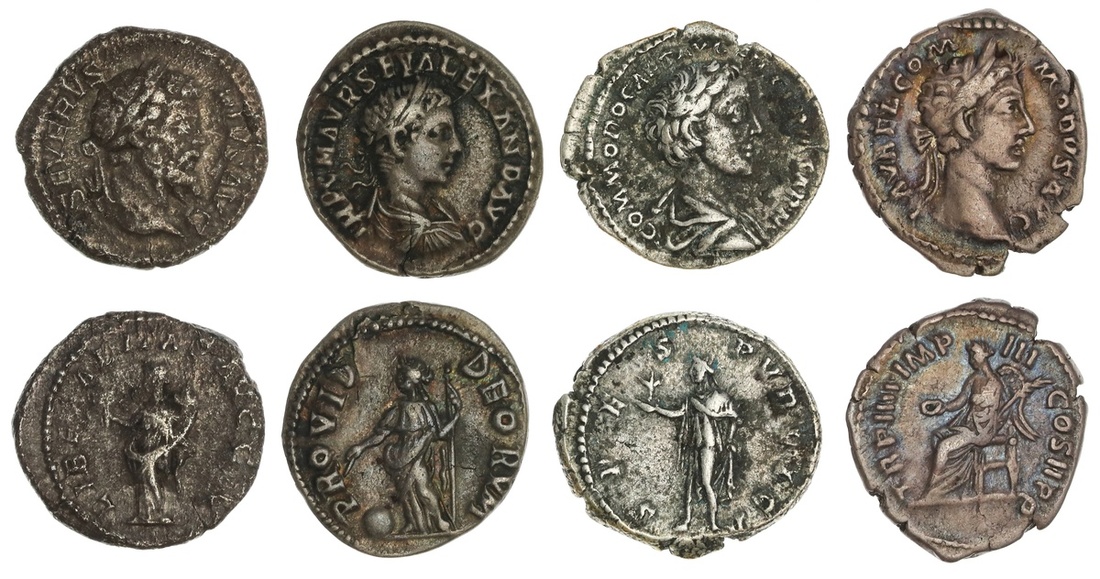 Roman Imperial. Quartet of Denarii: Commodus (2), Septimius Severus, Severus Alexander. Rvs. Liberalitas, Victory enthroned, Spes, Providentia. The Severan with rough surfaces. Very Fine. (4)