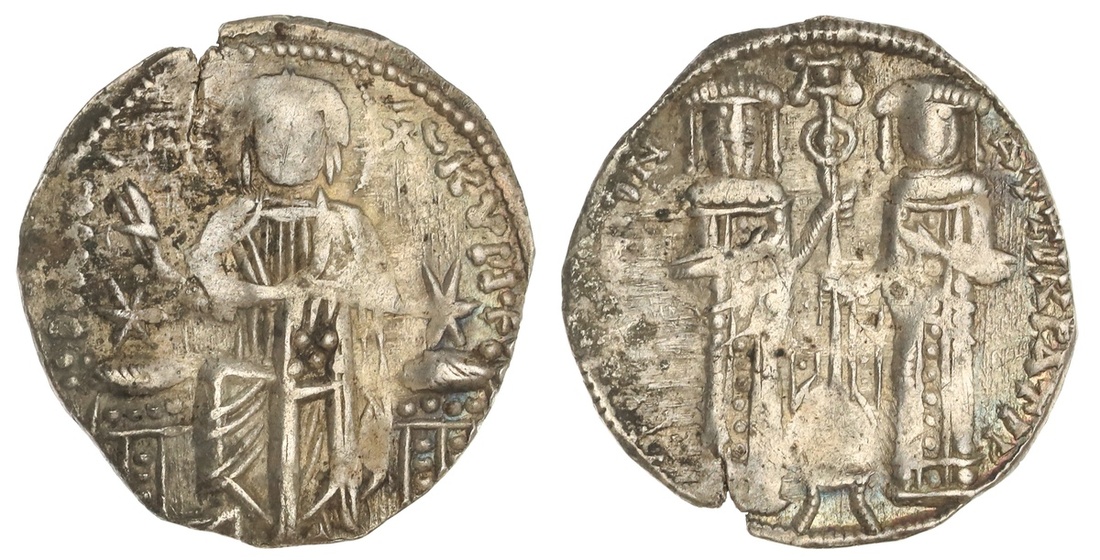 Byzantine Empire. Andronicus II Palaeologus and Michael IX (1282-1328). AR Basilikon, struck 1304-1320. Constantinople.1.85 gms. Nimbate Christ enthroned facing flanked by stars, rev. Andronicus and Michael standing facing holding a labarum between them. DOC 535-8, SB 2402. Very Fine.