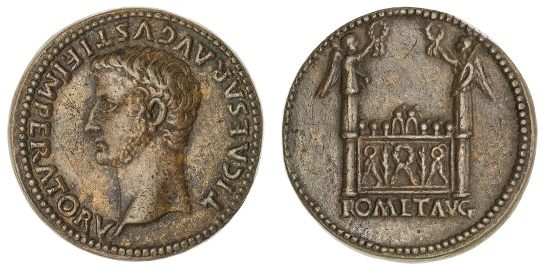 Paduan. After Giovanni Cavino. Tiberius. AE "Sestertius". 32.7 mm. Bare head left, rev. Altar of Lugdunum, ROME.T.AVG below. Extremely Fine.