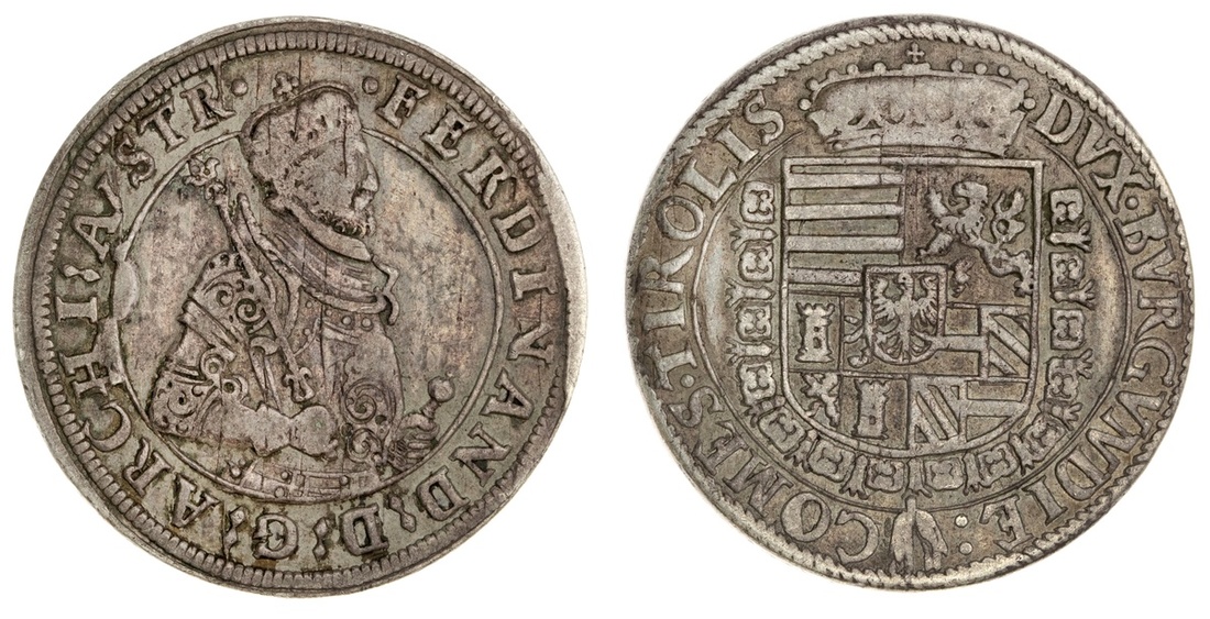 Austria. Archduke Ferdinand (1564-1595). Taler, nd. Crowned, armored half-figure right holding scepter and sword hilt, rev.Crowned Arms within Order chain. Dav.8095. Faint haymarking. Toned. Very Fine.