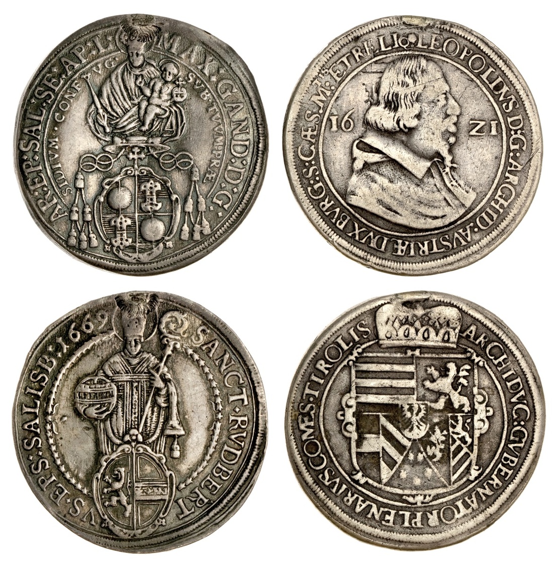 Austria and Salzburg. Pair of ex-mount Talers. Austria, Archduke Leopold. 1621; and Salzburg, 1669. Both with mounts removed at 12:00. VF Details. (2)