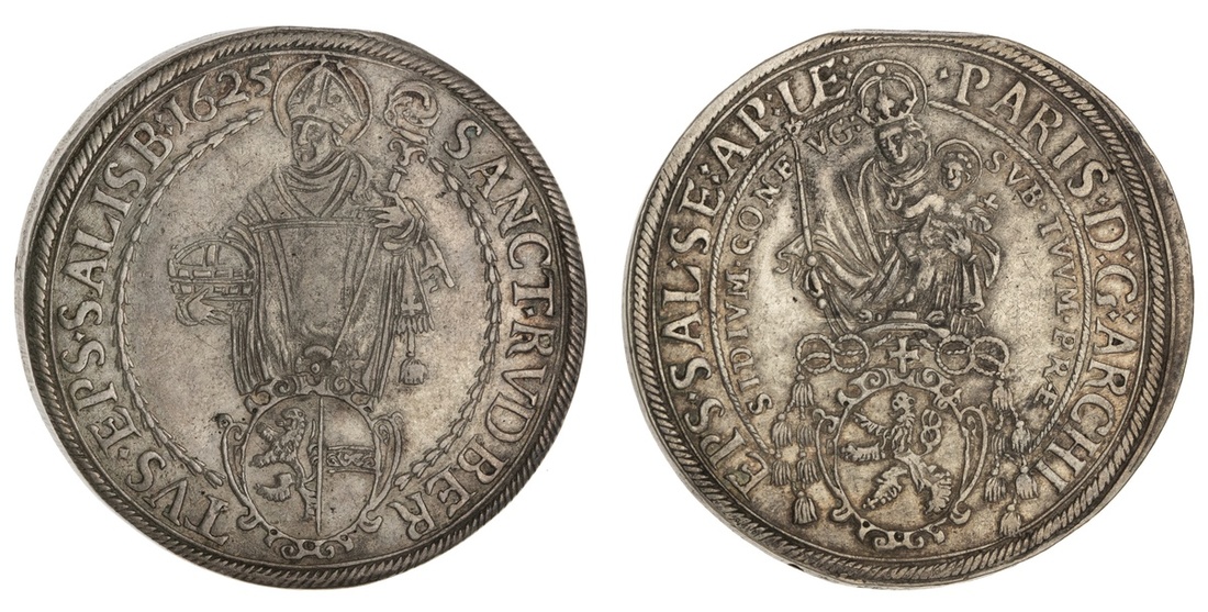 Salzburg. Paris v. Lodron (1619-1653). Taler, 1625. Madonna and Child above Arms, rev. St. Rupert standing ¾ left above Arms. Dav.3504, KM 87. Natural edge flaw at 12:00. Extremely Fine.