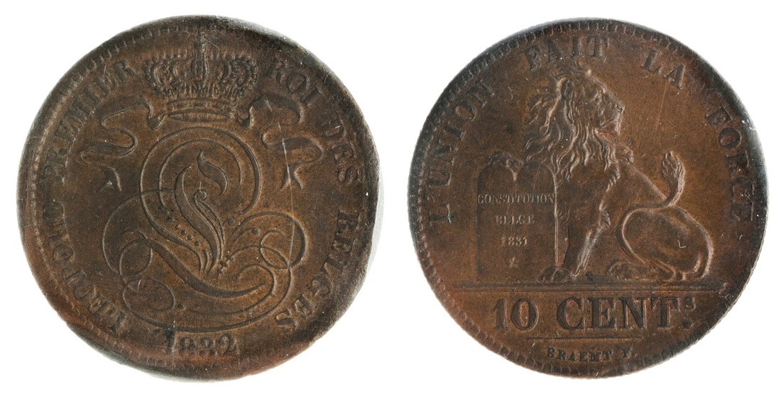 Belgium. Leopold I (1831-1865). 10 Centimes, 1832. Crowned monogram, rev. Lion seated left, head right, bracing tablet. KM 2.1. ICCS MS-60.