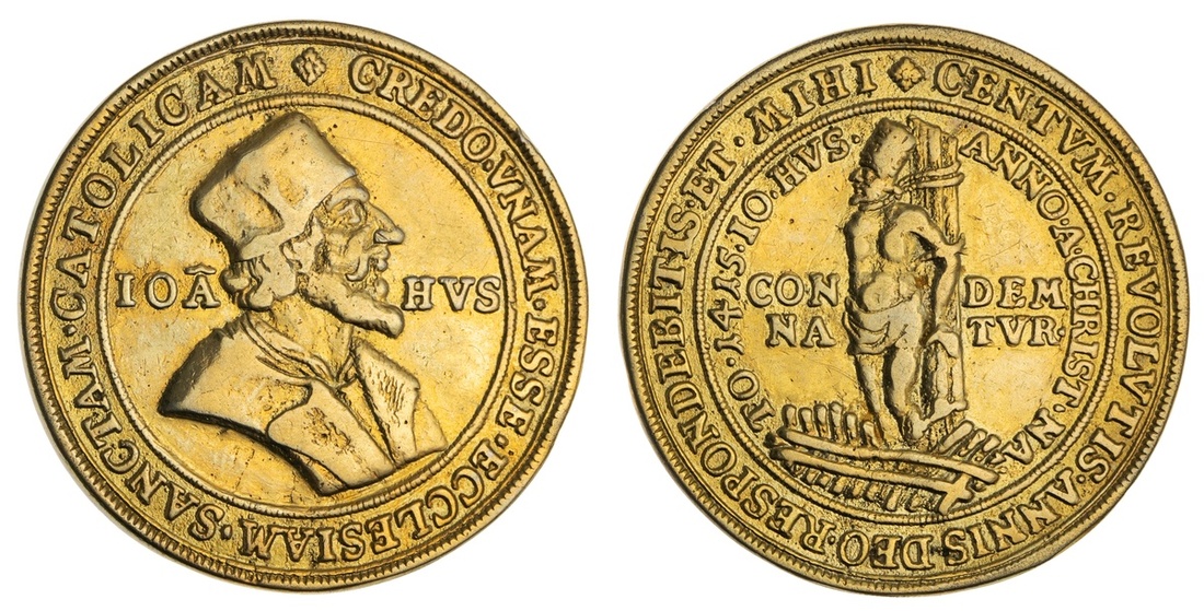 Bohemia. Medallic Taler, ca. 1730. 21.41 gms. Bust of Jan Hus right, IOA-HVS, rev. the Czech reformer being burned at the stake. Gilded. Good Very Fine.