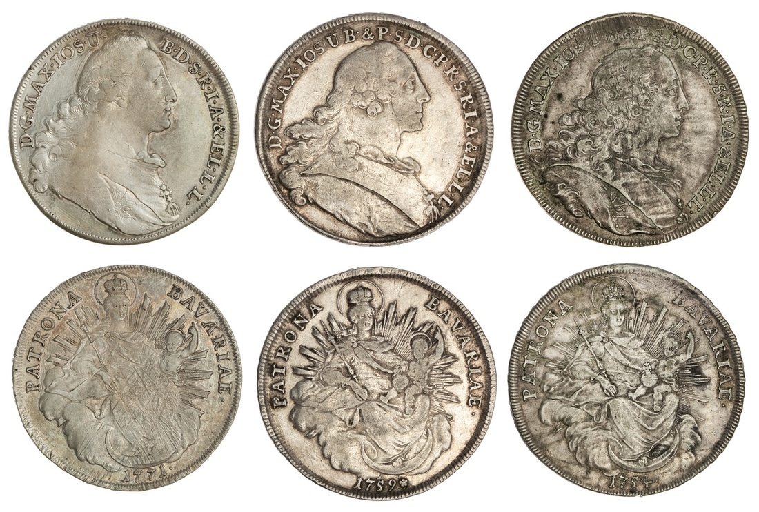 German States. Bavaria. Maximilian III Josef (1745-1777). Trio of Madonna Talers, 1754, 1759*, 1771. First and last with adjustment marks, 1771 heavier marks, the first with small edge cut with minute extruded strip. About VF. (3)