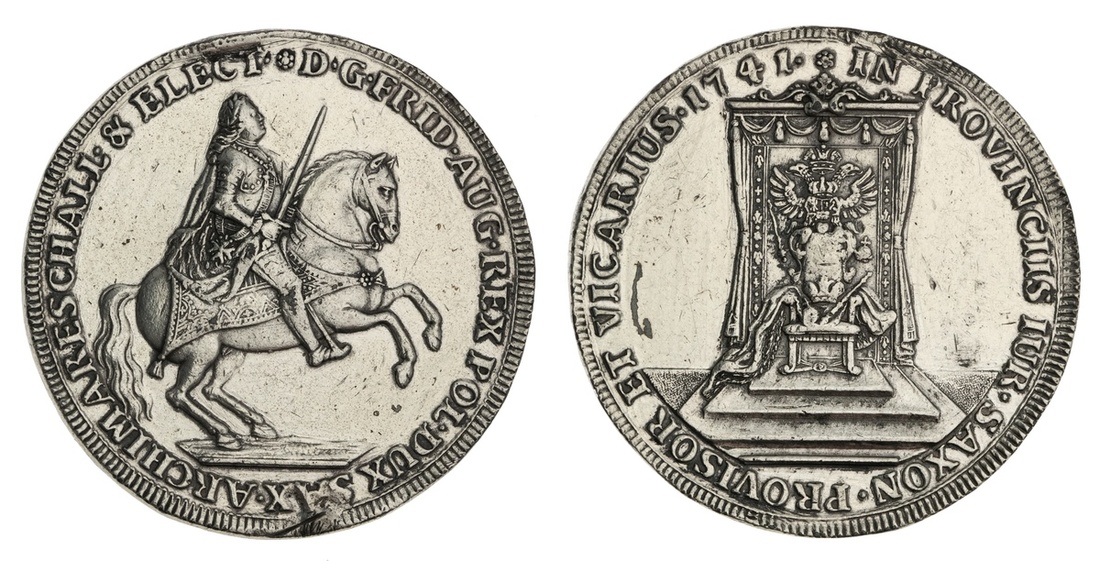 German States. Saxony. Friedrich August I (1733-1763). Vicariat Taler, 1741. The king on horse rearing right, rev. Throne, Arms on tapestry canopy behind. Dav.2669, KM 907. EF Details, polished and once in jewelry.
