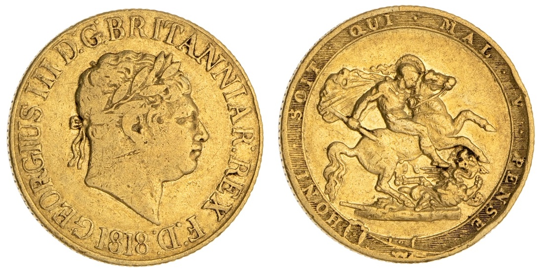 Great Britain. George III (1760-1820). Last or New Coinage. Sovereign, 1818. Ascending colon, clear space after REX. Laureate head right with short hair, rev. St. George and dragon, motto around. S.3785A, Marsh 2A, KM 674. Small reverse edge tap. About Fine/Fine.