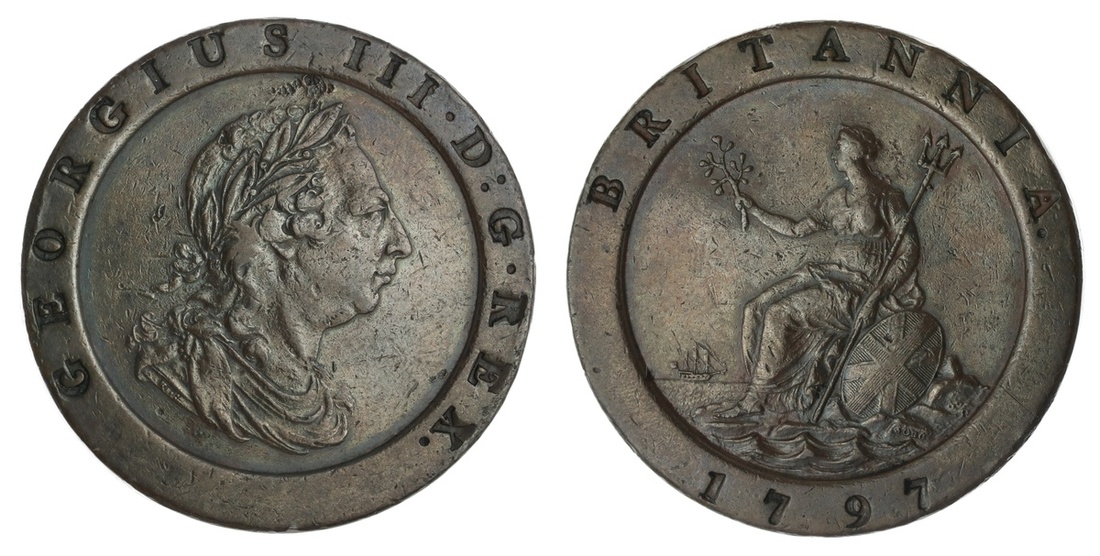 Great Britain. George III (1760-1820). "Cartwheel" Twopence, 1797. Laureate draped bust right in inset central circle, incuse legend around, rev. Britannia seated left. S.3776, KM 619. Contact marks, dig above head. Extremely Fine.