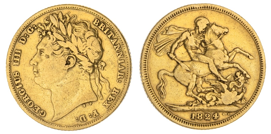 Great Britain. George IV (1820-1830). Sovereign, 1824. Laureate head left, rev. St. George. S.3800, Marsh 8, KM 682. Small obverse scuff. Fine.