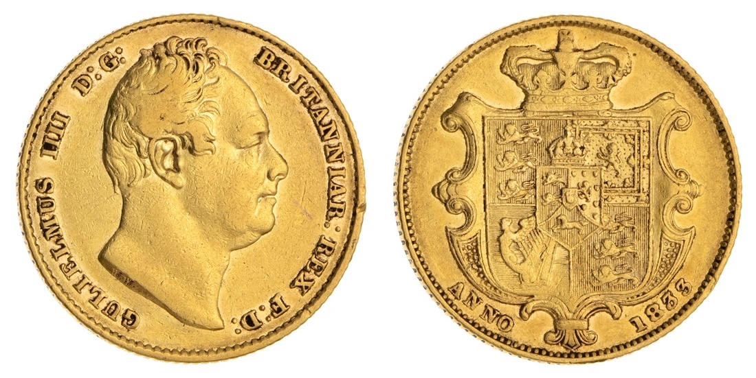 Great Britain. William IV (1830-1837). Sovereign, 1833. Bare head right, rev. Crowned and garnished Arms. S.3829B, Marsh 18, KM 717. Obverse rim nicks. VF/EF.