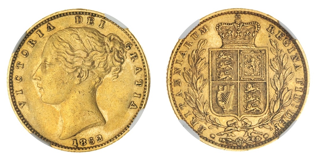 Great Britain. Victoria (1837-1901). Sovereign, 1852. Second young head left, rev. Crowned Arms within wreath. S.3852C, KM 736.1. NGC AU 55.