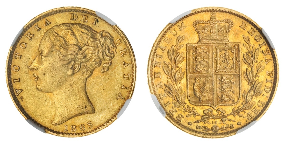 Great Britain. Victoria (1837-1901). Sovereign, 1863. Die No. 16. Young head left, incuse W.W., rev. Crowned Arms within wreath, die number below. S.3853, KM 736.2. NGC MS 61.
