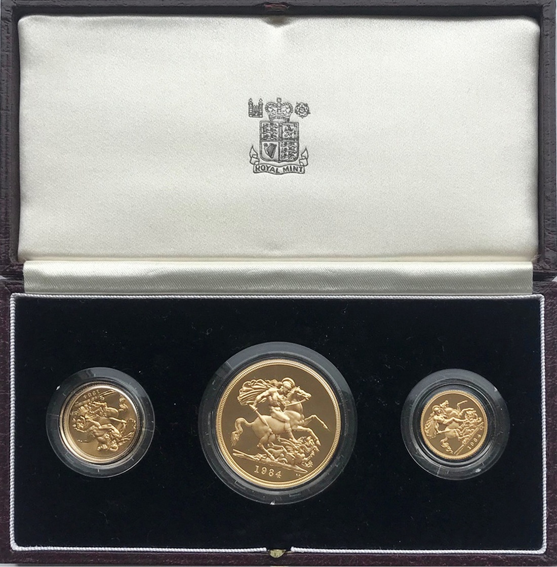 Great Britain. Elizabeth II (1952-). 1984 Gold Proof Set. ½ Sovereign, Sovereign and 5 Pounds. Elizabeth II portrait by Arnold Machin right, rev. St. George. KM PS46.