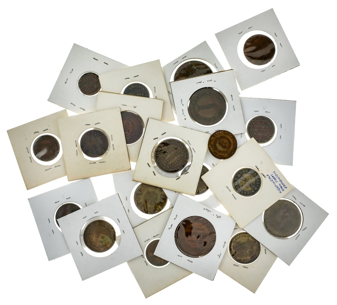 Great Britain. Lot of mid to late 19th Century Merchant and Advertising Tokens. Brass and Copper. Mostly London, Norwich, Newcastle, Manchester. Good-VF. (20)