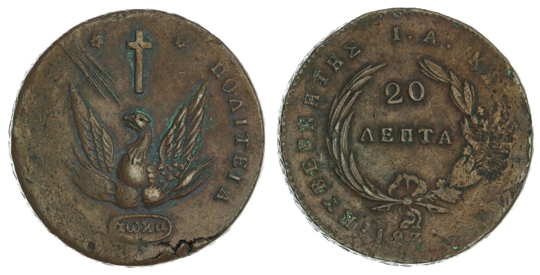 Greece. Republic, under John Capodistrias (1828-1831). 20 Lepta, 1831. Phoenix, cross above, rev. Value within wreath. KM 11. Typical surfaces, weak last digit of date. About Very Fine.