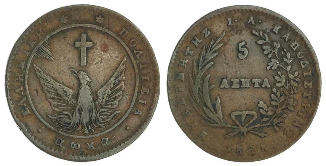 Greece. Republic, under John Capodistrias (1828-1831). 5 Lepta, 1828. Phoenix, cross above, within circle, rev. Value within wreath. KM 2. Fine.