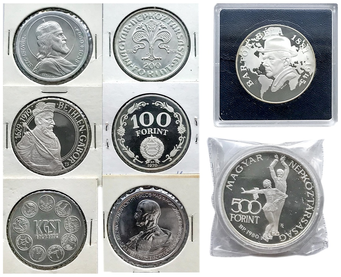 Hungary. Regency-Peoples Republic. Group of Silver Commemorative Issues. Includes: 5 Pengo, 1938 St. Stephen. Unc.; 500 Forint, 1980 Olympics-Lake Placid, 1981 Bartok; 200 Forint, 1979 Gabriel Bethlen. Brilliant Proof; and 1978 1st Gold Forint; 100 Forint, 1970 Liberation, 1974 KGST. BU; also 1943 aluminum 5 Pengo. (8)