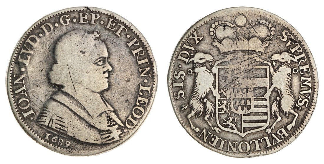 Liège. John Louis Eldern (1688-1694). Ducatone, 1689. Ecclesiastical bust right, rev. Capped and supported Arms. Dav.4299, KM 101. Scratches at centers. About Fine.