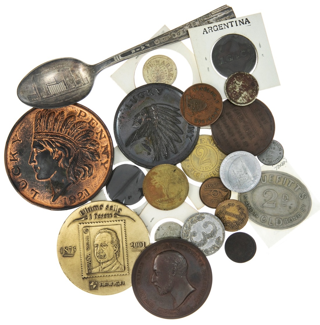 Exonumia - Odds & Ends. Includes Souvenir Lucky Pennies - Chicago and Canada; modern medal; Colonial and Indian Exhibition, London 1886. Bronze, 52mm; Eiffel Tower 1889 souvenir medal; uncertain c/s, miscellaneous tokens and NY World's Fair 1939 Souvenir Spoon, others. Fine-EF. (25)