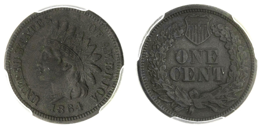 1864 Indian Head Cent, L on ribbon. PCGS Genuine. Env. Damage - XF Details.