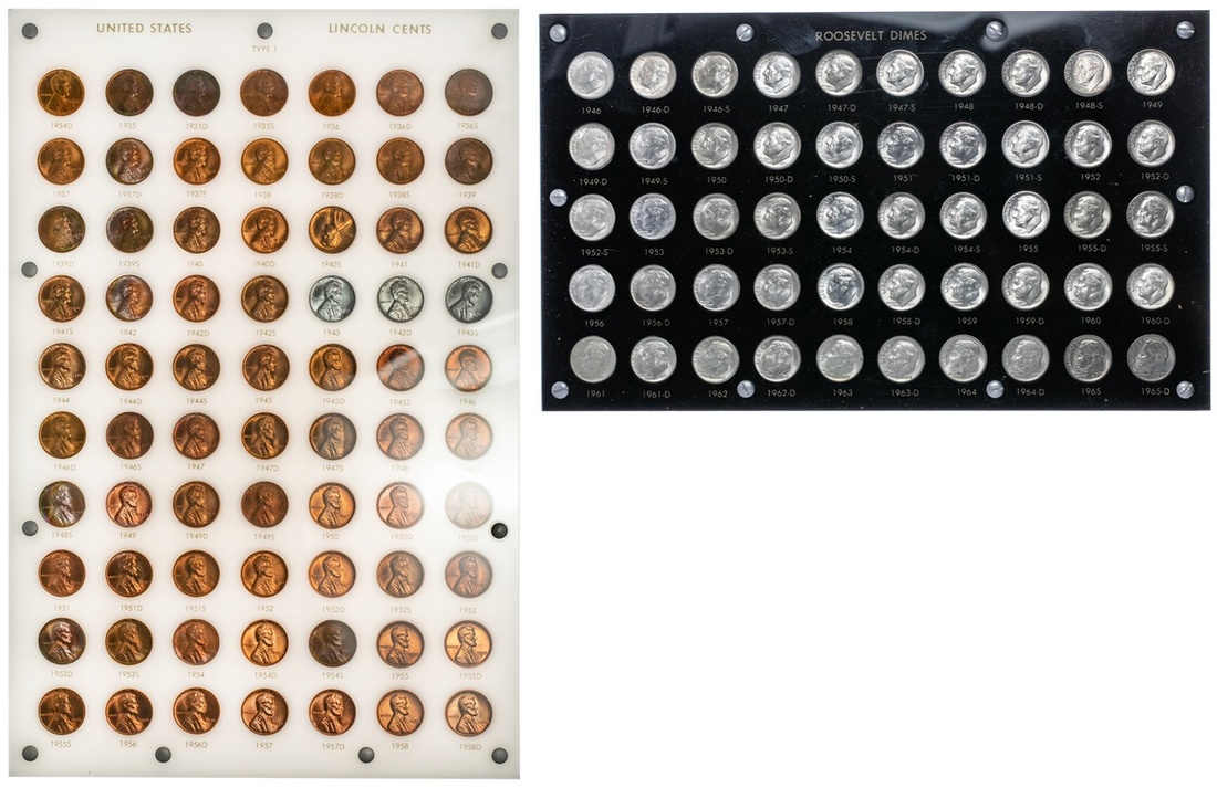 1946-1965-D Roosevelt Dimes Complete Unc.-BU. Housed in a custom Lucite frame; Lincoln Cents, 1934-D to 1958-D Complete. Unc-BU. Housed in a custom white Lucite frame.