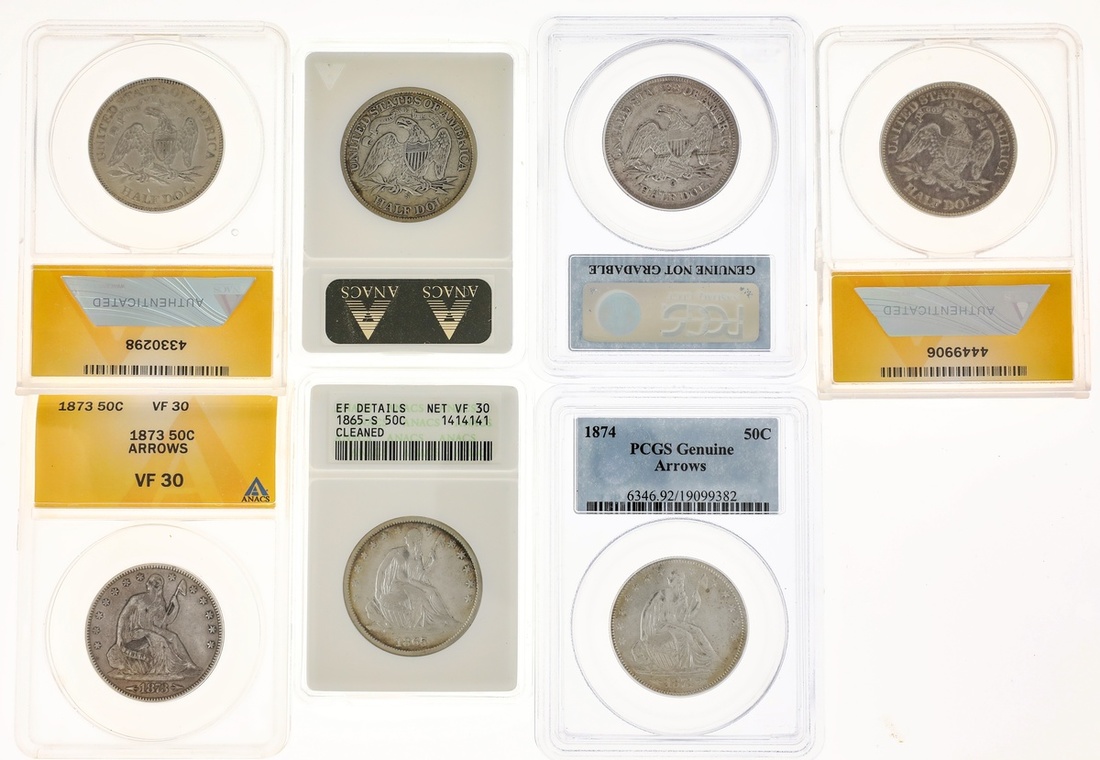Lot of encapsulated Liberty Seated Half Dollars. 1855-O Arrows, PCGS Genuine (hairlines, Unc details); 1865-S and 1868-S, both ANAC EF Details Cleaned Net VF 30; 1870-S, ANACS EF 40 Details - Cleaned; 1873 Arrows, ANACS VF 30; 1874 Arrows, PCGS Genuine (AU Details - Cleaned) and 1875, ANACS AU 50 Details - Cleaned. (7)